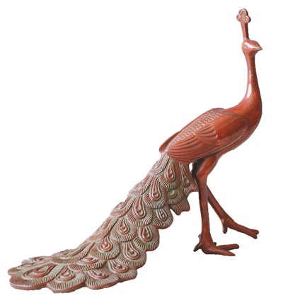 云南斑銅有生斑和熟斑兩種。生斑銅采用含銅量90%以上的自然銅為原材料,經(jīng)過鍛打、燒斑、打磨、顯斑等多道工序制成。它“妙在有斑,貴在渾厚”,褐紅色的表面呈現(xiàn)出流光溢彩、變化微妙的自然晶斑。熟斑是在熔化的純銅中加入適當(dāng)比例的其他金屬,在混而不合的狀態(tài)下,經(jīng)過澆鑄成型、磨光、著色顯斑等工藝制成。熟斑斑紋略呈放射狀,大小分布有致,造型較生斑更為豐富、細(xì)膩。展廳里展示了生斑香盒、生斑花瓶、熟斑孔雀、熟斑牛鼎等,精美絕倫,令人贊嘆。